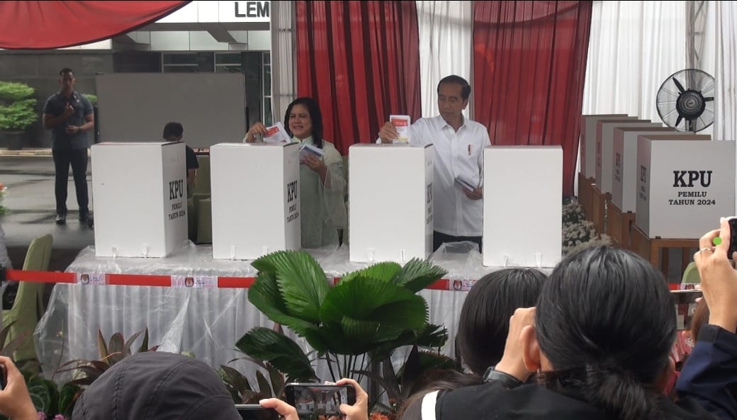 Presiden Joko Widodo beserta Ibu Negara Iriana Widodo menggunakan hak suara di TPS 10, Gambir, Jakarta Pusat