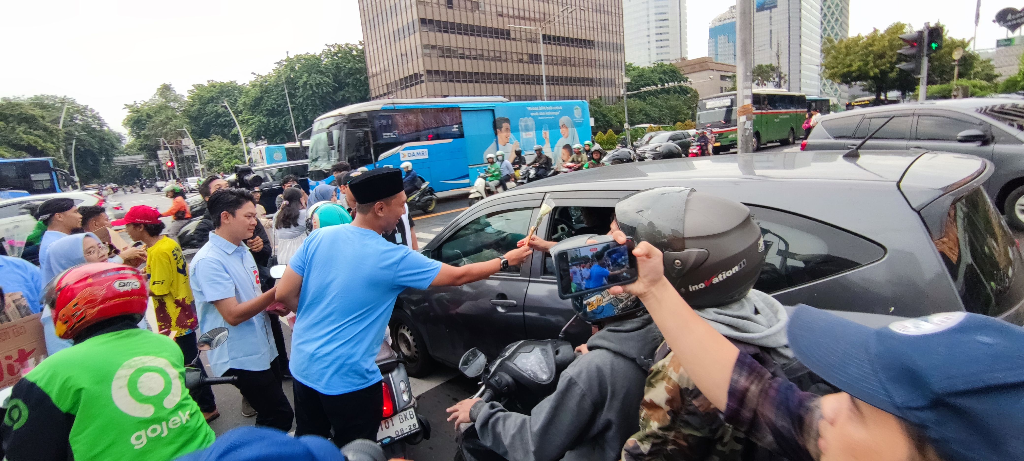Komandan TKN Fanta Arief Rosyid Hasan saat membagikan cokelat dan bunga kepada masyarakat di kawasan Sarinah, Jakarta Pusat. Foto M Julnis Firmansyah