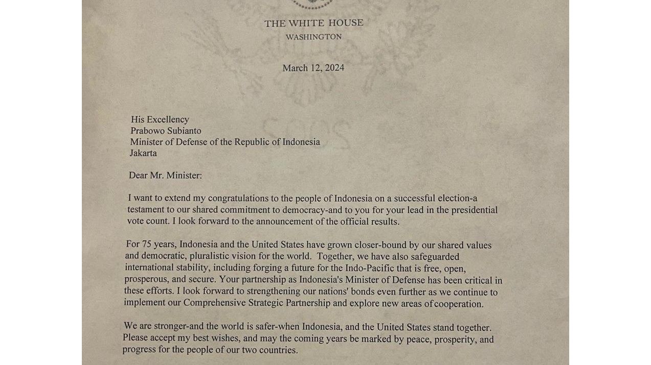 Surat itu diantar langsung kepada Prabowo oleh Duta Besar Amerika Serikat untuk ASEAN Yohannes Abraham, kepada Prabowo pada Kamis, 14 Maret 2024.