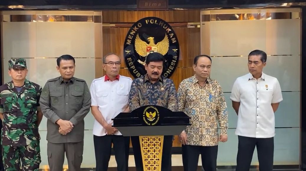 Menteri Koordinator Politik, Hukum dan Keamanan Hadi Tjahjanto bersama Menkominfo Budi Arie Setiadi dan Kepala BSSN Hinsa Siburian di Kemenko Polhukam, Jakarta Pusat pada Selasa (19/3/2024).