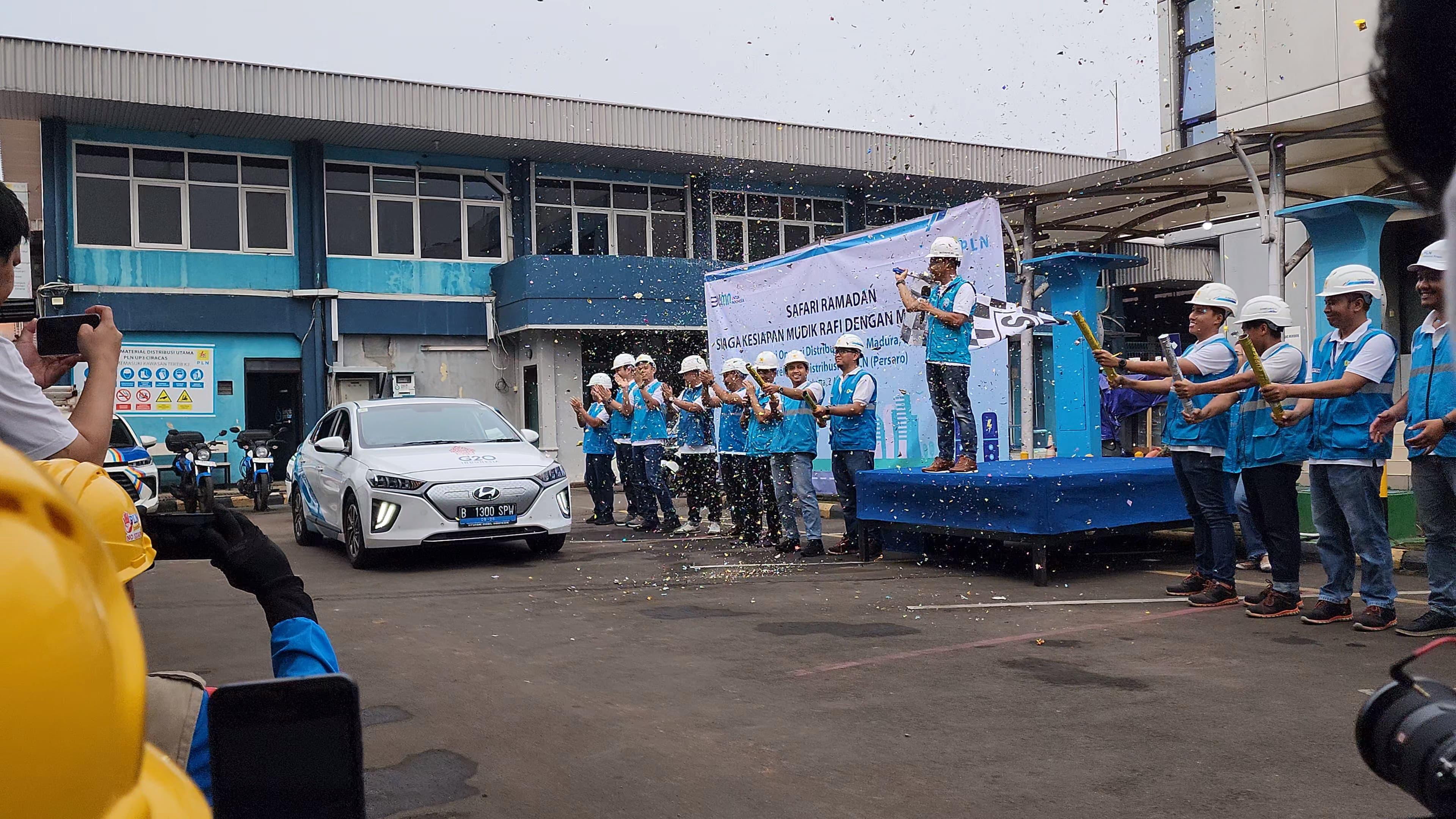 Pelepasan uji coba mudik dengan mobil listrik rute Jakarta - Bali dilakukan oleh General Manager PLN UID Jakarta Raya Lasiran (berdiri di atas podium) didampingi jajaran manajemen PLN UID Jakarta Raya dan disaksikan petugas lapangan yang ikut dalam acara tersebut
