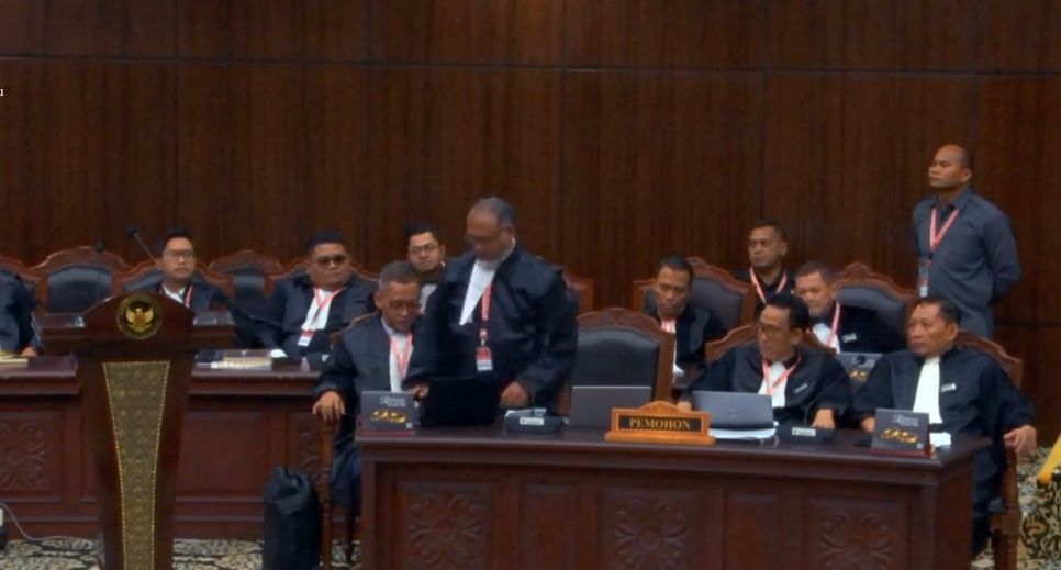 Jakarta, tvrijakartanews - Anggota Tim Hukum Nasional pasangan calon 01, Anies-Muhaimin, Bambang Widjojanto alias BW meninggalkan ruang sidang atau "walk out" ketika Pakar Hukum Universitas Gadjah Mada, Edward Omar Sharif Hiariej alias Eddy Hiariej hendak memberikan keterangan dalam sidang sengketa Pilpres 2024 Mahkamah Konstitusi (MK), Kamid (4/4/2034).