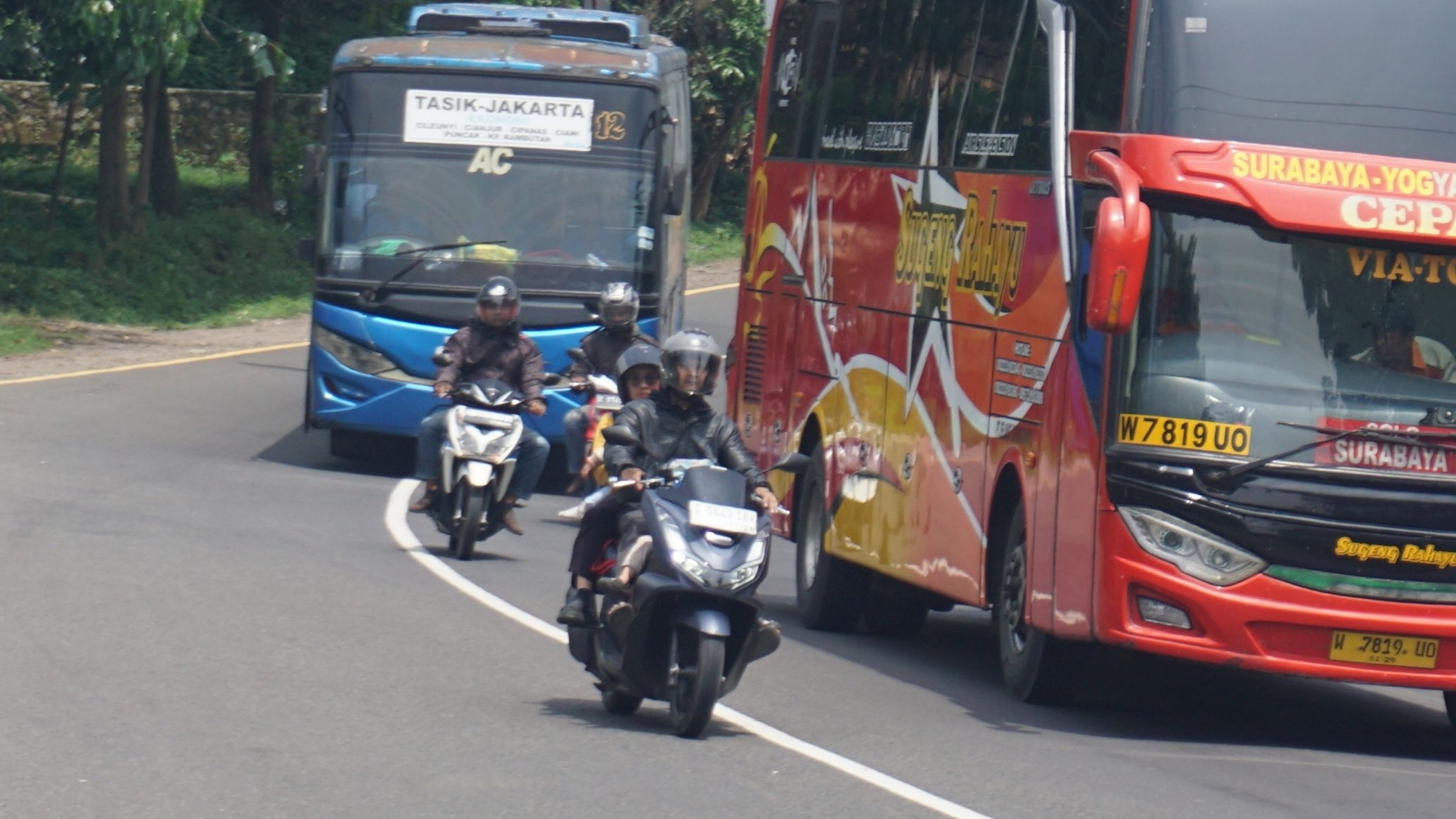 Para pemudik yang menggunakan motor melintas jalur Nagreg, Kabupaten Bandung, Jawa Barat. Foto M Julnis Firmansyah