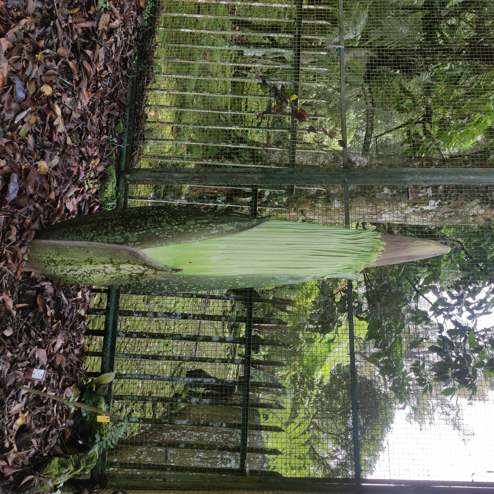 Bunga bangkai Kebun Raya Cibodas, terletak bersebelahan dengan taman lumut. Kondisi sekitar bunga bangkai tampak ternaungi oleh pohon-pohon yang tinggi dan rimbun, salah satunya pohon rasamala atau Altingia excelsa.