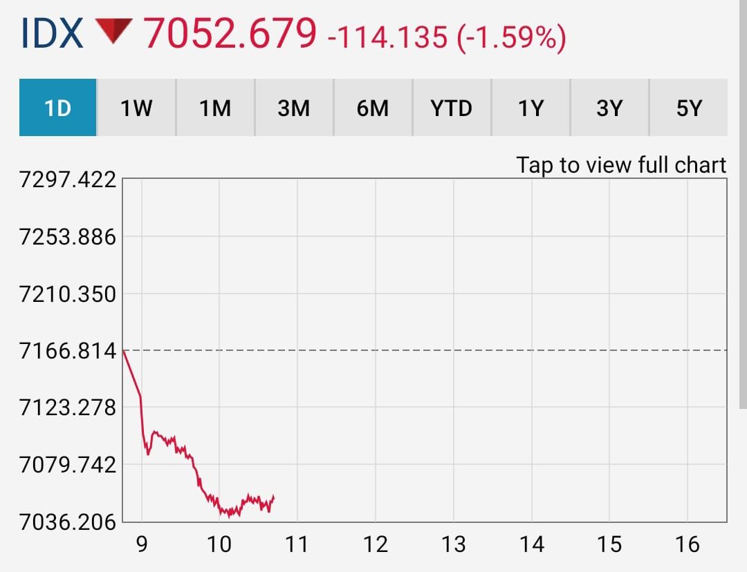 Jakarta, tvrijakartanews - Indeks Harga Saham Gabungan (IHSG) Bursa Efek Indonesia (BEI) bergerak turun mengikuti pelemahan bursa saham di kawasan Asia. IHSG dibuka melemah 35,35 poin atau 0,49 persen ke posisi 7.131,45.