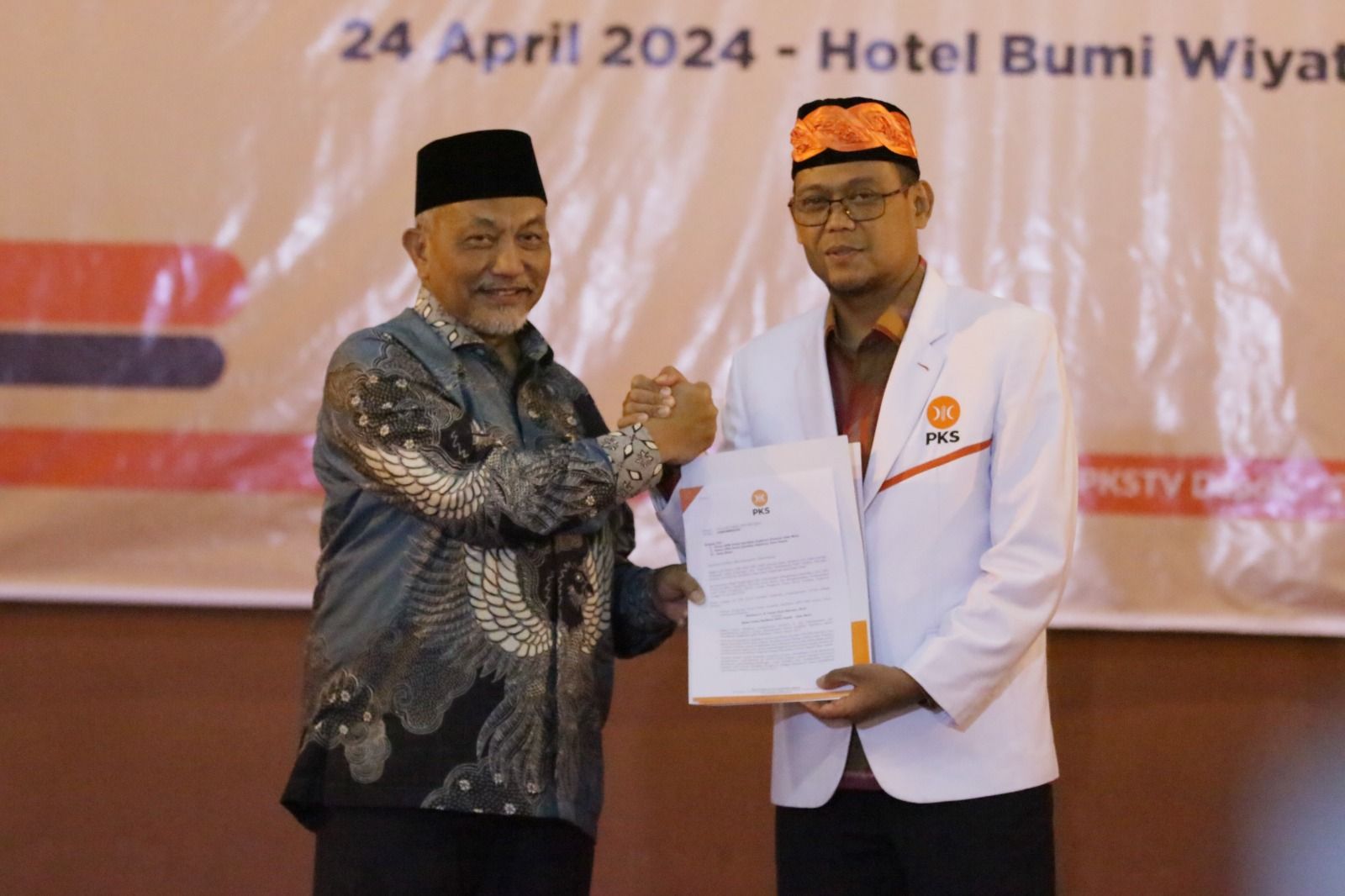 Presiden PKS Ahmad Syaikhu saat menyerahkan surat keputusan rekomendasi Imam Budi Hartono untuk maju pada pemilihan kepala daerah (Pilkada) Kota Depok 2024. (Foto: DPD PKS Depok).