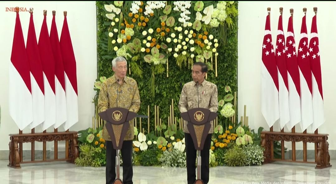 Presiden Joko Widodo (kanan) bersama Perdana Menteri (PM) Singapura Lee Hsien Loong (kiri) saat memberikan keterangan pers dalam pertemuan Leaders Retreat Sinagpura-Indonesia di Istana Kepresidenan Bogor pada Senin (29/4/2024). (Foto: YouTube: Selretariat Presiden).