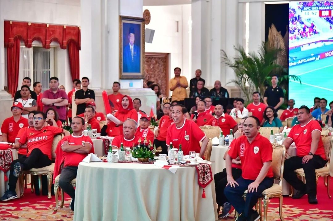 Momen Presiden Joko Widodo bersama sejumlah menteri Kabinet Indonesia Maju (KIM) saat nonton bareng pertandingan Timnas Indonesia melawan Uzbekistan pada laga semifinal Piala Asia 2024 di Istana Negara, Senin (29/4/2024) malam. (Foto: Vico - Biro Pers Sekretariat Presiden).