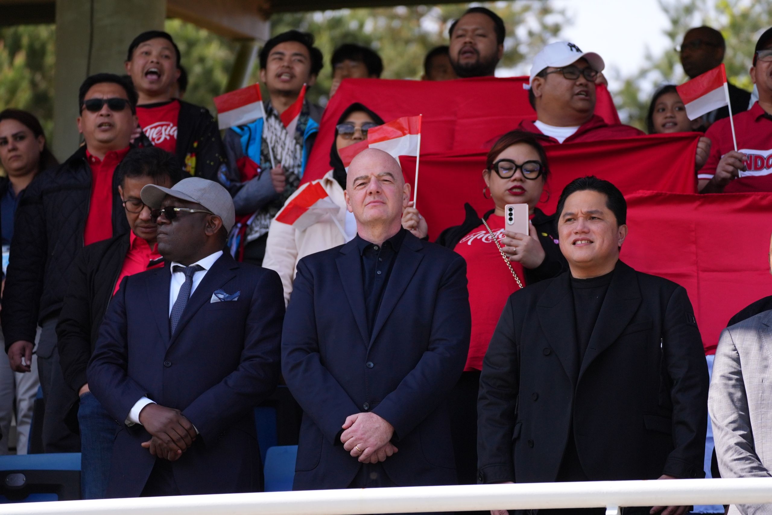 Ketua Umum PSSI Erick Thohir (Kanan) bersama dengan Presiden Presiden FIFA Gianni Infantino (kiri) menyaksikan pertandingan play-off Olimpiade antara Timnas Indonesia U-23. (Tangkap layar Laman resmi PSSI.org)