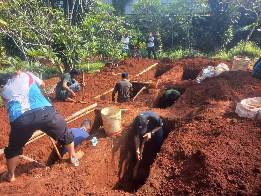 Warga tengah bahu-membahu menggali liang lahat untuk korban kecelakaan bus SMK Lingga Kencana di TPUI Darul Maqodir, Rangkapan Jaya Baru, Depok pada Minggu (12/5/2024). (Foto: Chaerul Halim).