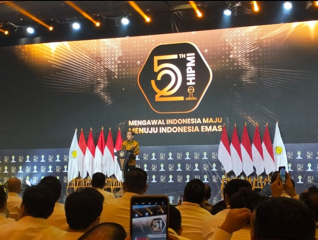 Presiden Joko Widodo (Jokowi) ketika memberikan sambutan pada acara peringatan Hari Ulang Tahun (HUT) Himpunan Pengusaha Muda Indonesia (HIPMI) ke-52 yang digelar di Hotel Fairmont, Jakarta Pusat, Senin (10/6/2024). (Foto: Chaerul Halim).