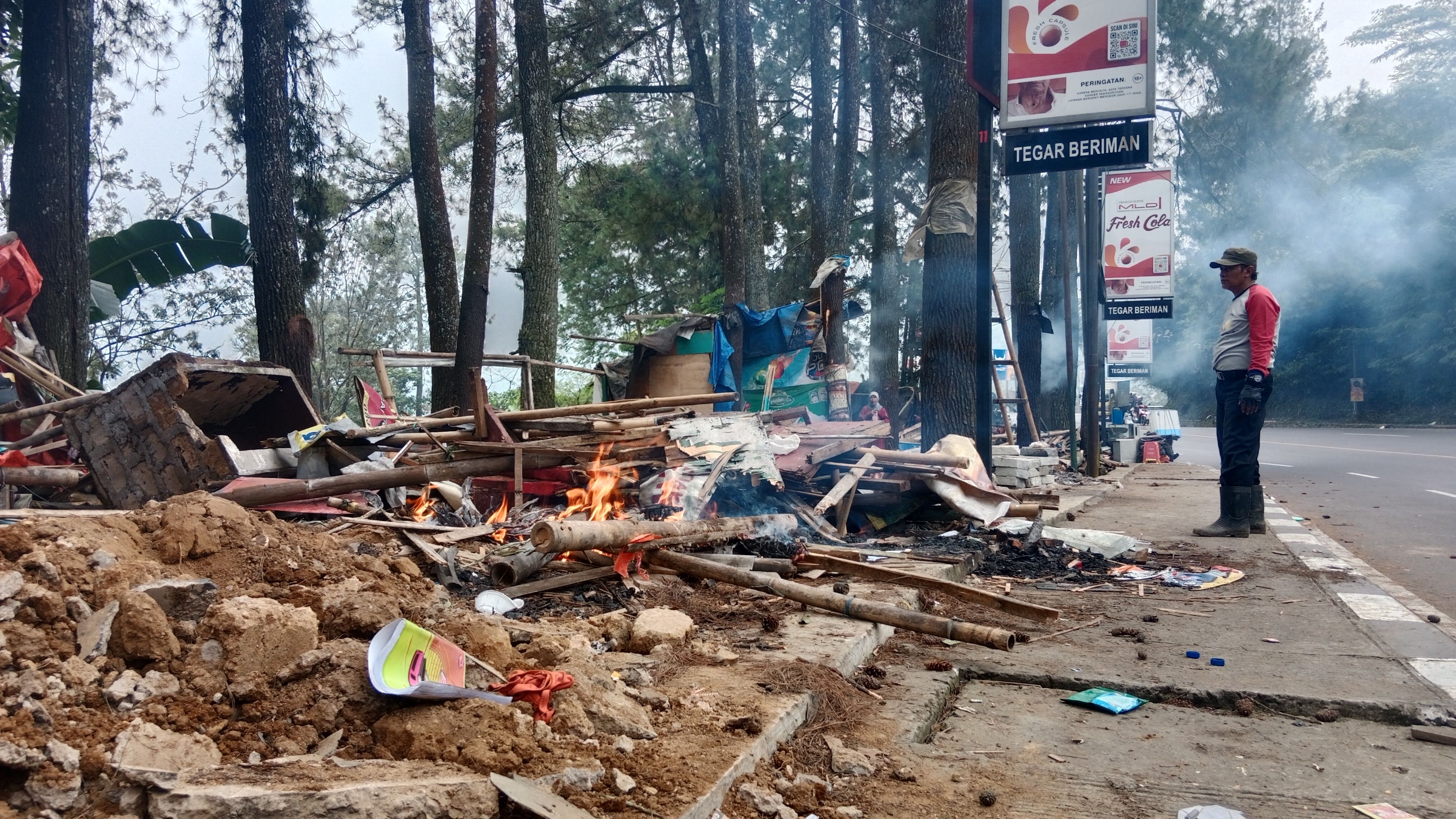 Pemilik lapak dagangan di jalur Puncak, Bogor, Jawa Barat hanya bisa meratapi bangunan usahanya yang telah rata dengan tanah / Foto: Dimas Yuga Pratama