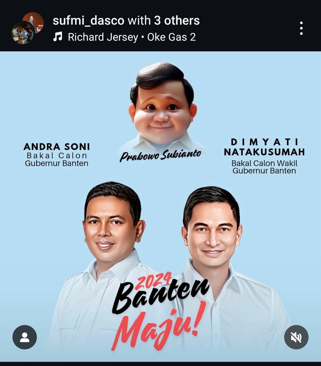 Beredarnya pamplet di media sosial pasangan Andra Soni - Dimyati Natakusumah, yang langsung dibagikan oleh Instagram pengurus DPP Gerindra @sufmi_dasco, banyak mendapatkan dukungan dari warganet, kini semakin meramaikan situasi perpolitikan di Banten.