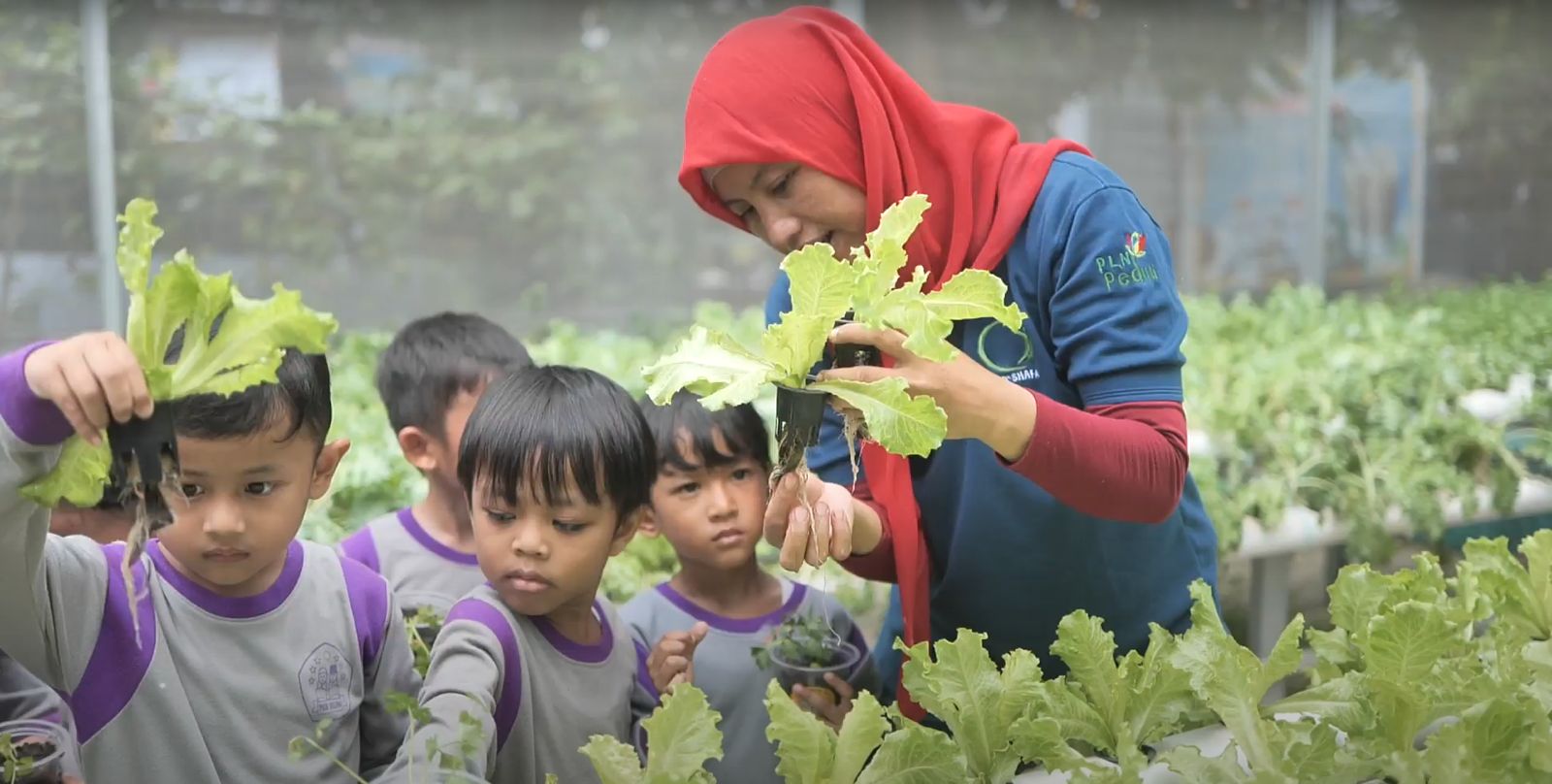Anak-anak dari PAUD Delima terlihat antuasia mendengarkan penjelasan dari Haryati tentang sayuran yang mereka panen. Foto: PLN UID Jakarta Raya