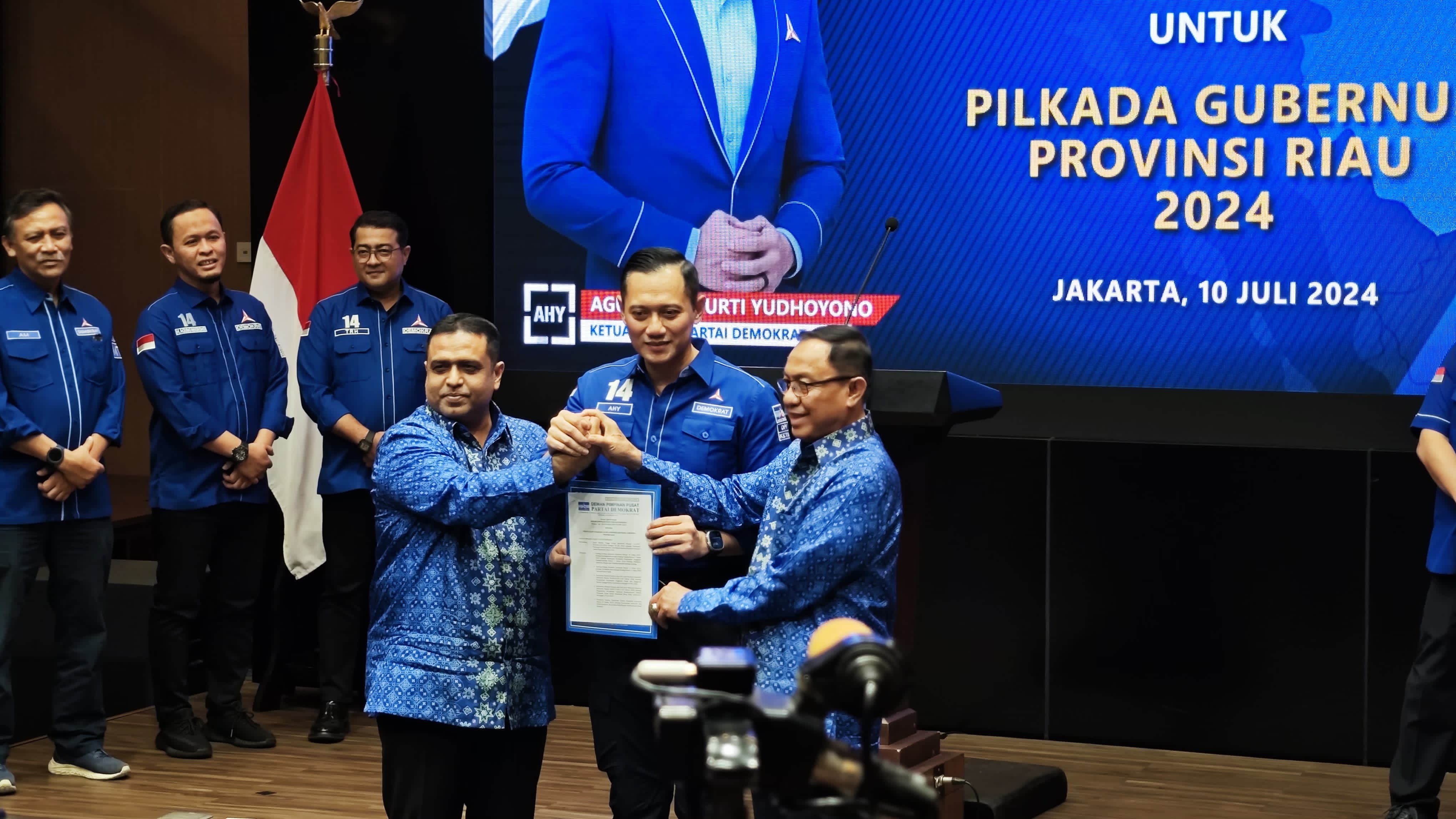 Ketum Partai Demokrat, Agus Harimurti Yudhoyono alias AHY menyerahkan surat rekomendasi untuk pasangan Nasir-Wardana di Pilkada Riau 2024. Foto M Julnis Firmansyah