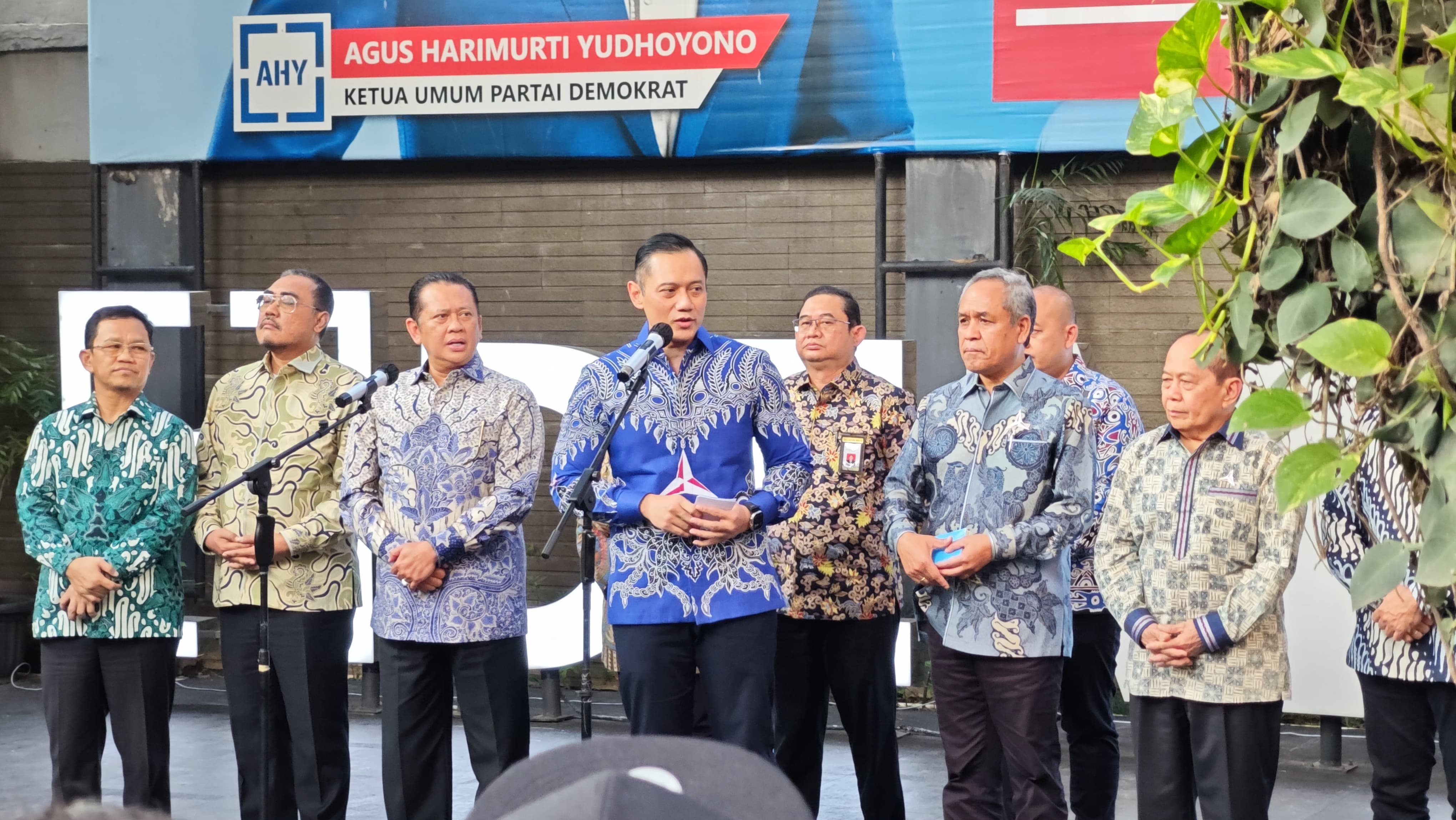 Setelah sekitar 90 menit pertemuan berlangsung, AHY dan para pimpinan menyapa awak media yang telah menunggu.