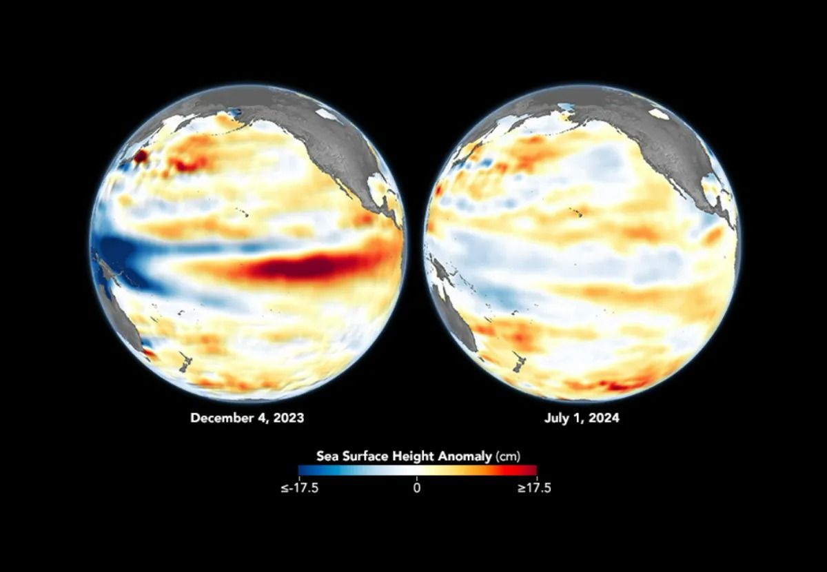 Melansir ifl science (17/7) tahun 2023 hingga 2024 ditandai oleh fase El Niño yang sangat dahsyat yang akhirnya berakhir pada bulan Mei. Dalam gambar yang baru dirilis, anomali tinggi permukaan laut ditunjukkan di Samudra Pasifik tengah dan timur pada tanggal 4 Desember 2023, mendekati puncak El Niño, dibandingkan dengan 1 Juli 2024, selama fase netral saat ini.