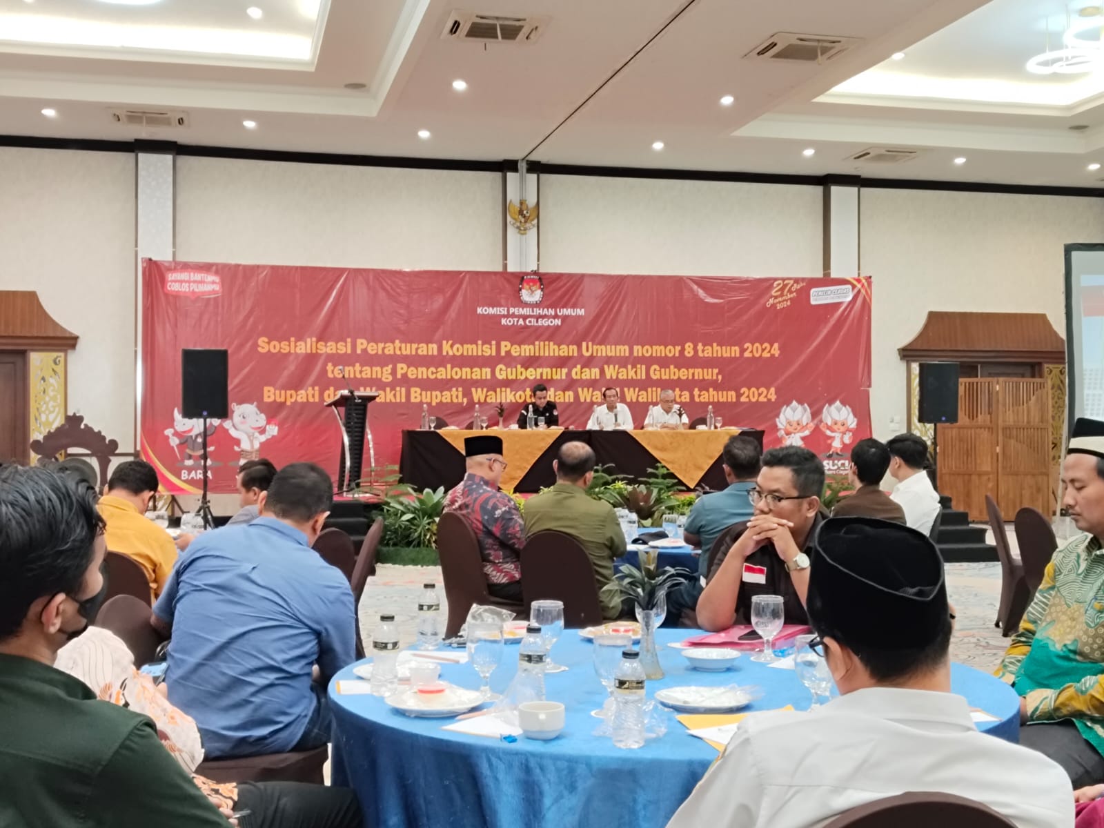 Cilegon, tvrijakartanews - Komisi Pemilihan Umum (KPU) Kota Cilegon melakukan sosialisasi Peraturan KPU Nomor 8 Tahun 2024 tentang Pencalonan Gubernur dan Wakil Gubernur, Bupati dan Wakil Bupati, Wali Kota dan Wakil Wali Kota yang bertempat di salah satu hotel di Kecamatan Purwakarta, Kota Cilegon, Rabu (24/07/2024).